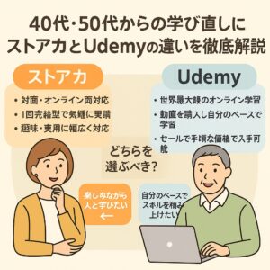 40代・50代からの学び直しに|ストアカとUdemyの違いを徹底解説 はじめに 「新しいことを学んでみたい」「副業や趣味に役立つスキルを身につけたい」そう思う40代・50代の方は増えています。 でも、 もう学校に通う時間はない 続けら...